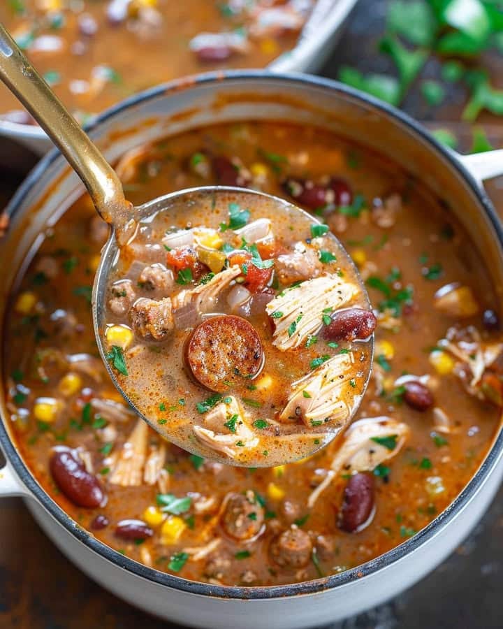 A vibrant and hearty one-pot dish featuring chicken, shrimp, and andouille sausage simmered in a rich, spicy tomato-based Creole sauce with the holy trinity of vegetables.