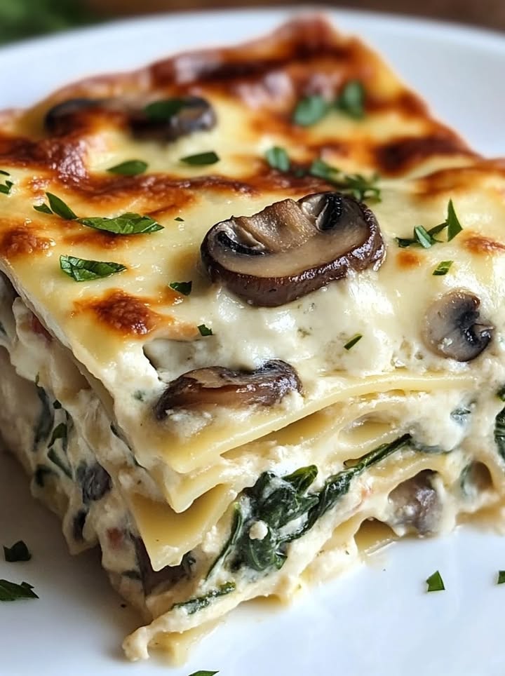 A rich and creamy meatless lasagna layered with a savory mushroom and spinach filling, creamy ricotta, and a decadent white sauce.