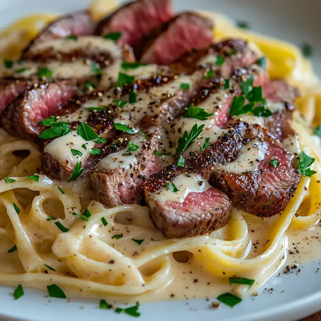 A quick and creamy pasta dish featuring tender steak mixed with fettuccine in a rich Alfredo sauce.