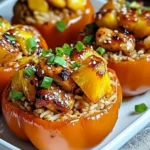 The aromas of garlic and ginger sizzling in the pan will draw everyone to the kitchen, while the sweet tang of pineapple melds with the umami-rich teriyaki sauce, creating a symphony of flavors that dance on your tongue. Each bite offers a delightful contrast: the juicy, marinated chicken paired with fluffy rice inside a tender, slightly charred bell pepper that holds everything together perfectly. The textures are spot-on—crisp edges on the peppers giving way to a warm, hearty filling that’s not too soggy or dry, thanks to precise baking techniques. This Teriyaki Pineapple Chicken & Rice Stuffed Peppers recipe promises a burst of tropical sweetness balanced by savory notes, making it as visually appealing as it is delicious, with every forkful leaving you craving more.