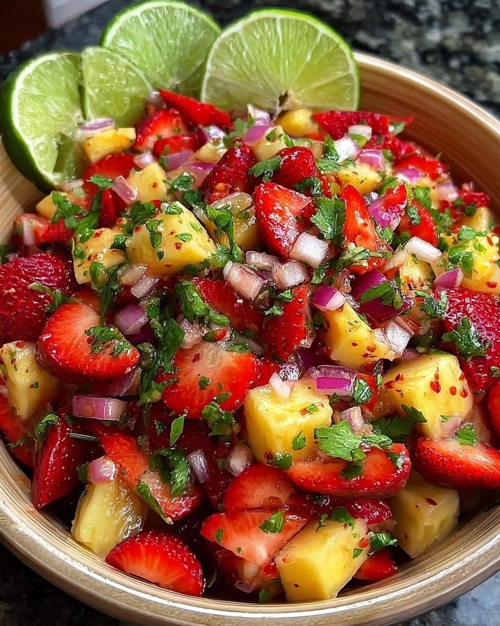 A vibrant, sweet, and tangy salsa that combines fresh strawberries, pineapple, and jalapeƱo for a refreshing tropical twist. Perfect as a dip or a topping for grilled fish or chicken.